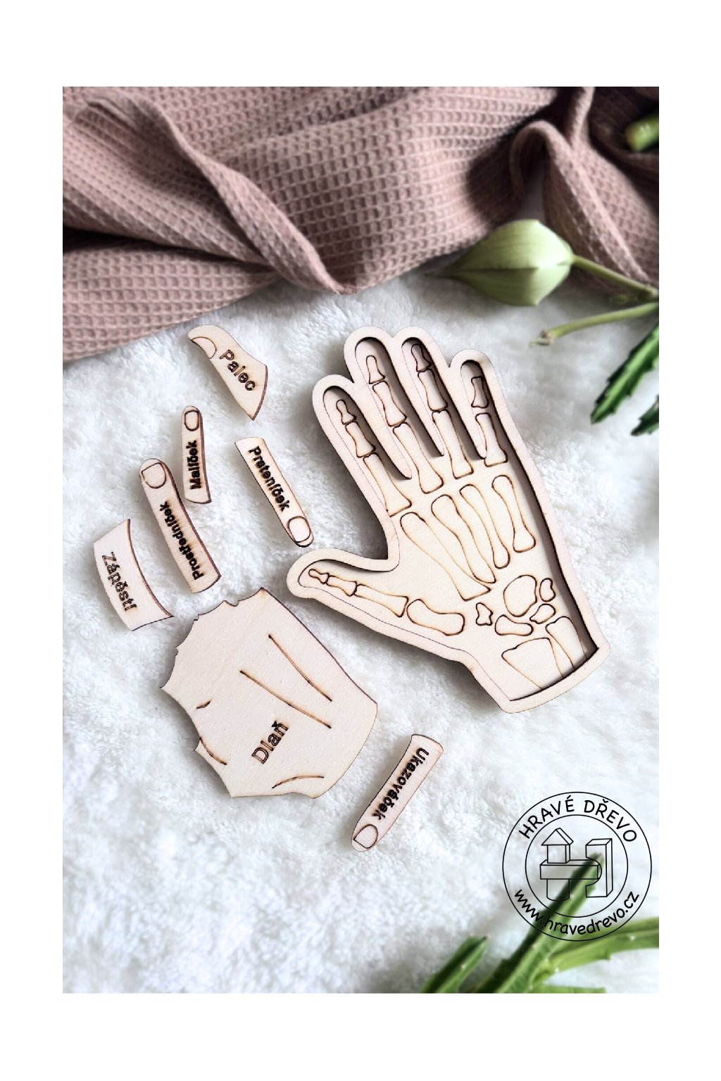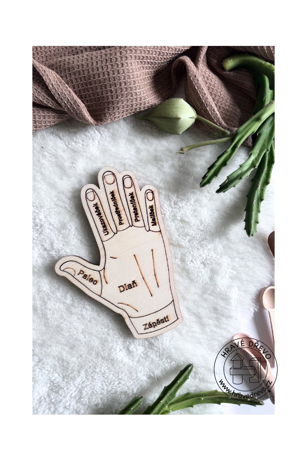 - Design: Rozřezané části prstů a dlaně s názvy prstů