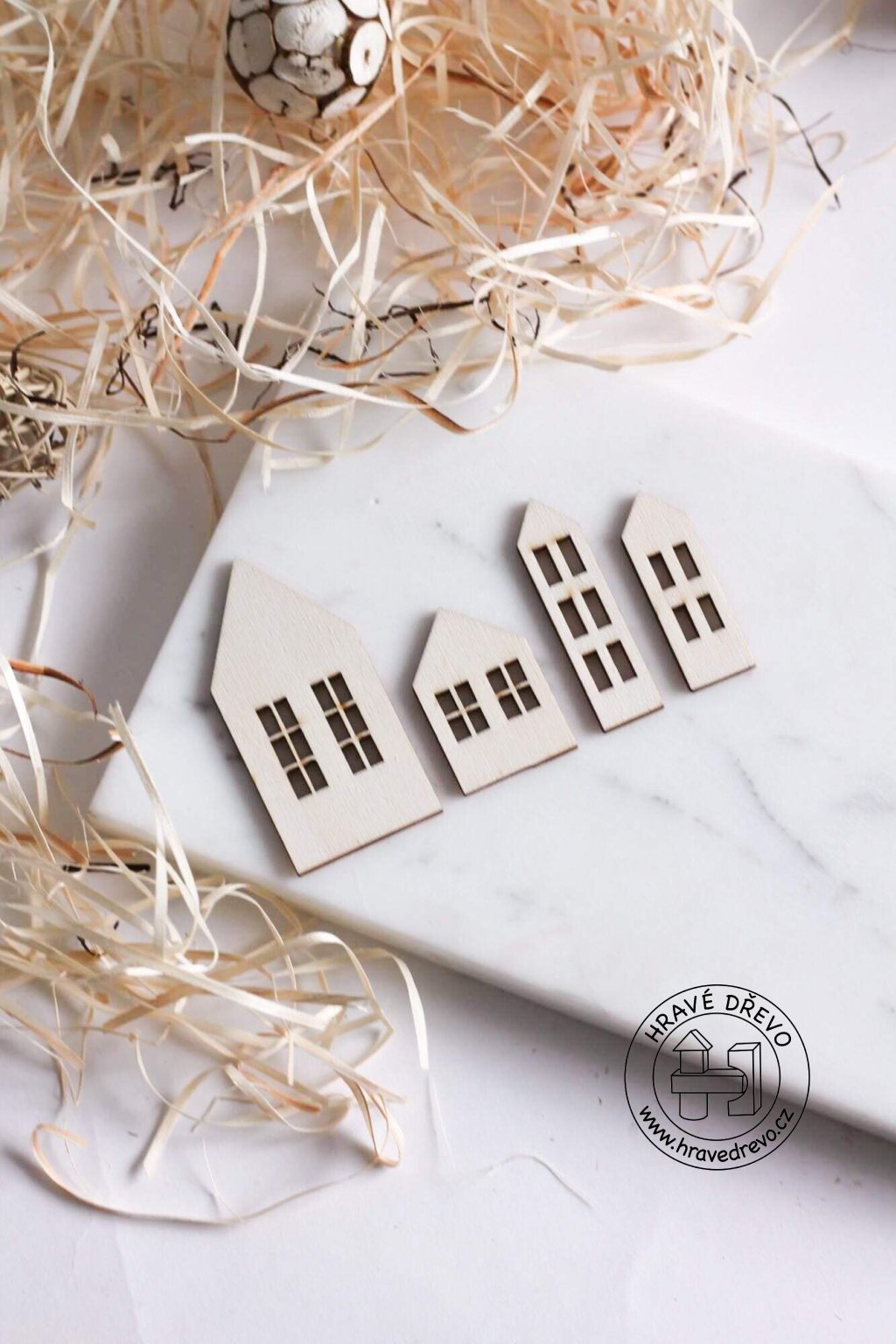 Dřevěná dekorace ve tvaru domečků. Vhodné k dekoraci, papírovému či jinému tvoření. Výřez je perfektní na dotvoření (např. pastelkami či fixami, ubrousky, aj..).